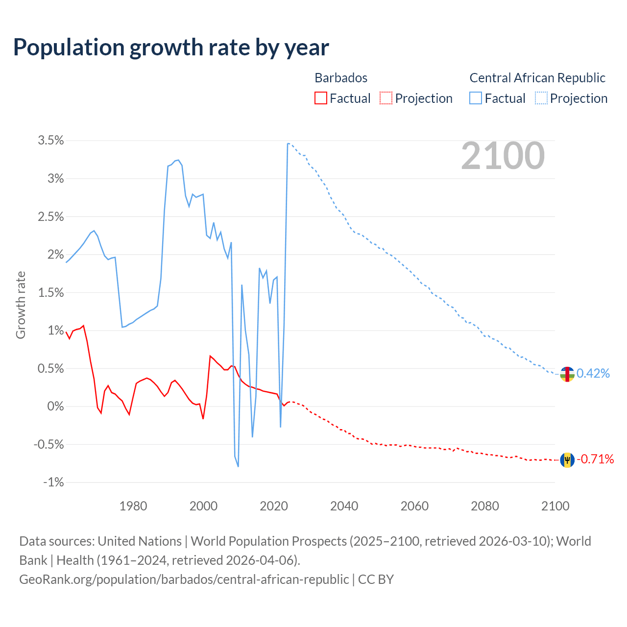 - For the last 10 years, Barbados has had an average growth rate of +0.16% per year vs +1.27% in the Central African Republic.