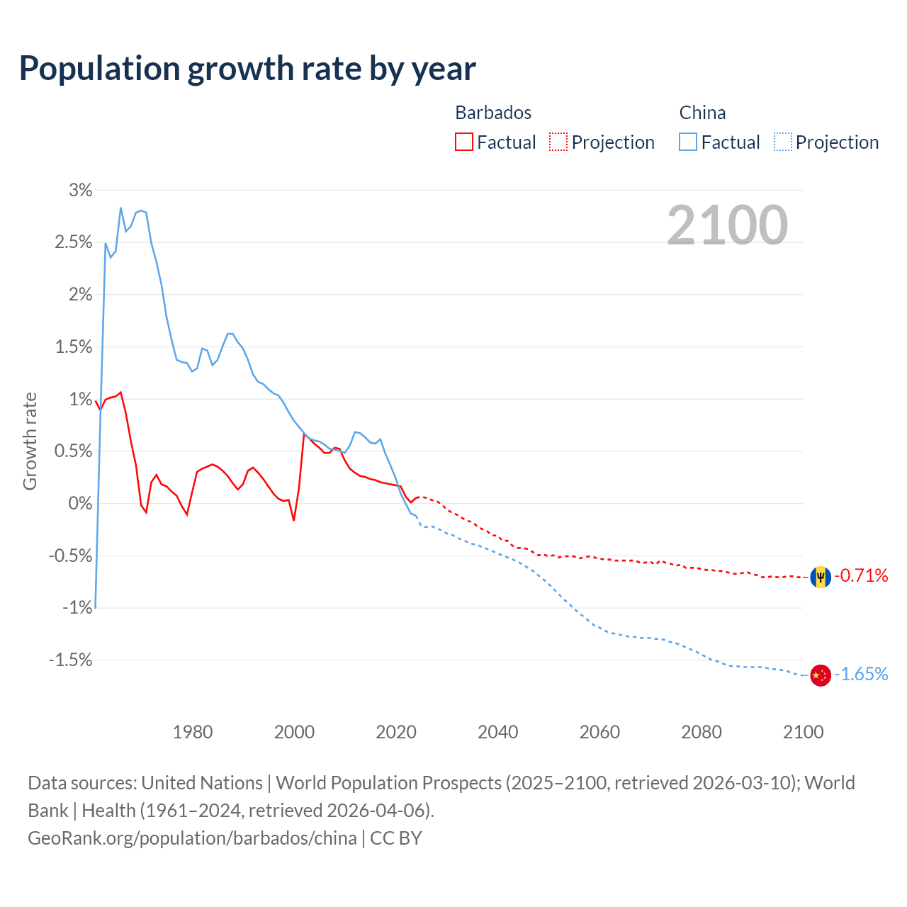 - For the last 10 years, Barbados has had an average growth rate of +0.16% per year vs +0.3% in China.