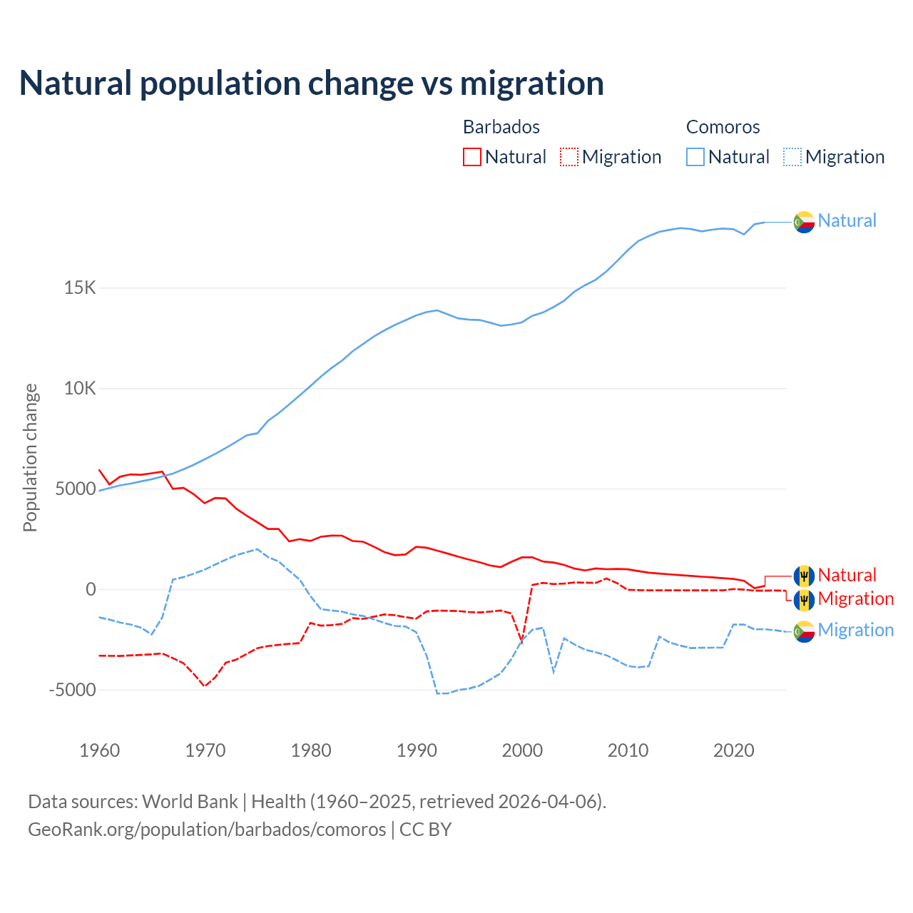 Over the last 10 years, 89.5% of the population change in Barbados is from natural causes (a gain of 4,936 people) and 10.5% is from migration (a loss of 578 people). In Comoros 87.9% is from natural causes (a gain of 179,319 people) and 12.1% is from migration (a loss of 24,709 people).