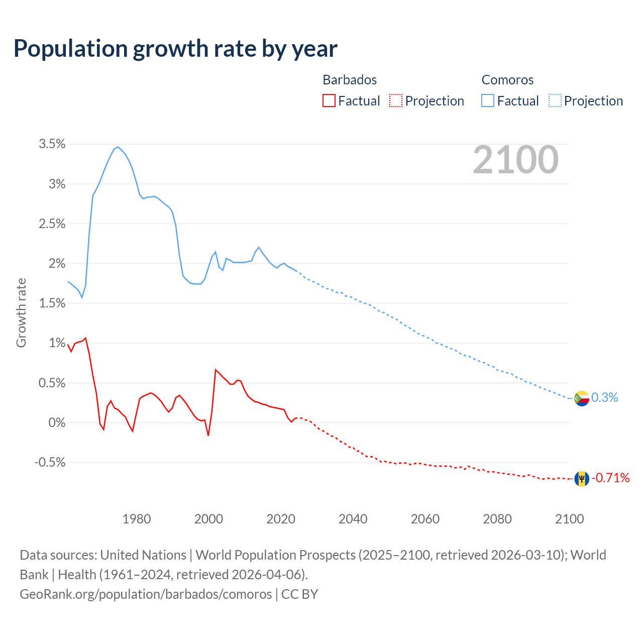 - For the last 10 years, Barbados has had an average growth rate of +0.16% per year vs +2.01% in Comoros.
