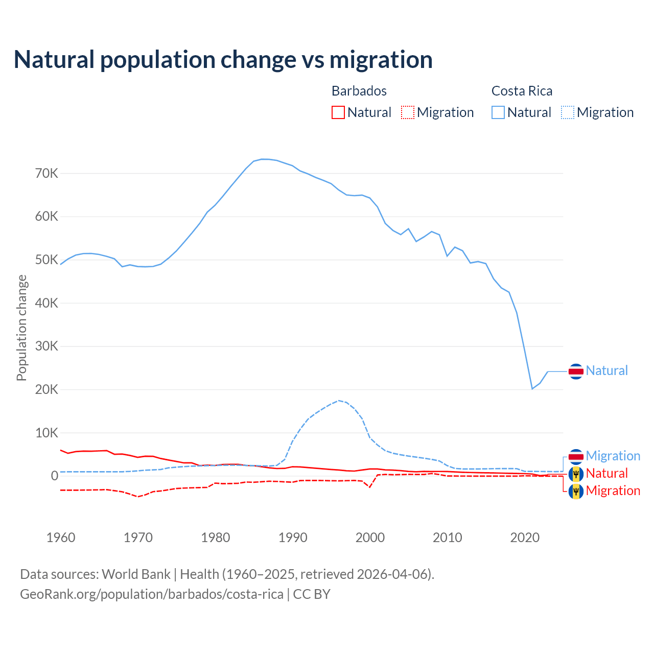 Over the last 10 years, 89.5% of the population change in Barbados is from natural causes (a gain of 4,936 people) and 10.5% is from migration (a loss of 578 people). In Costa Rica 96.3% is from natural causes (a gain of 362,624 people) and 3.69% is from migration (a gain of 13,900 people).