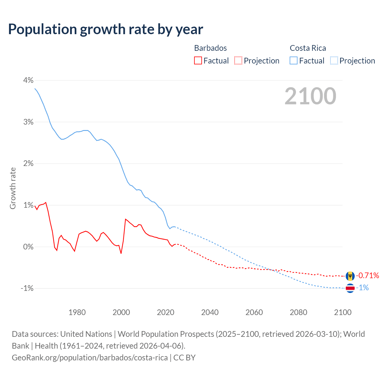 - For the last 10 years, Barbados has had an average growth rate of +0.16% per year vs +0.77% in Costa Rica.