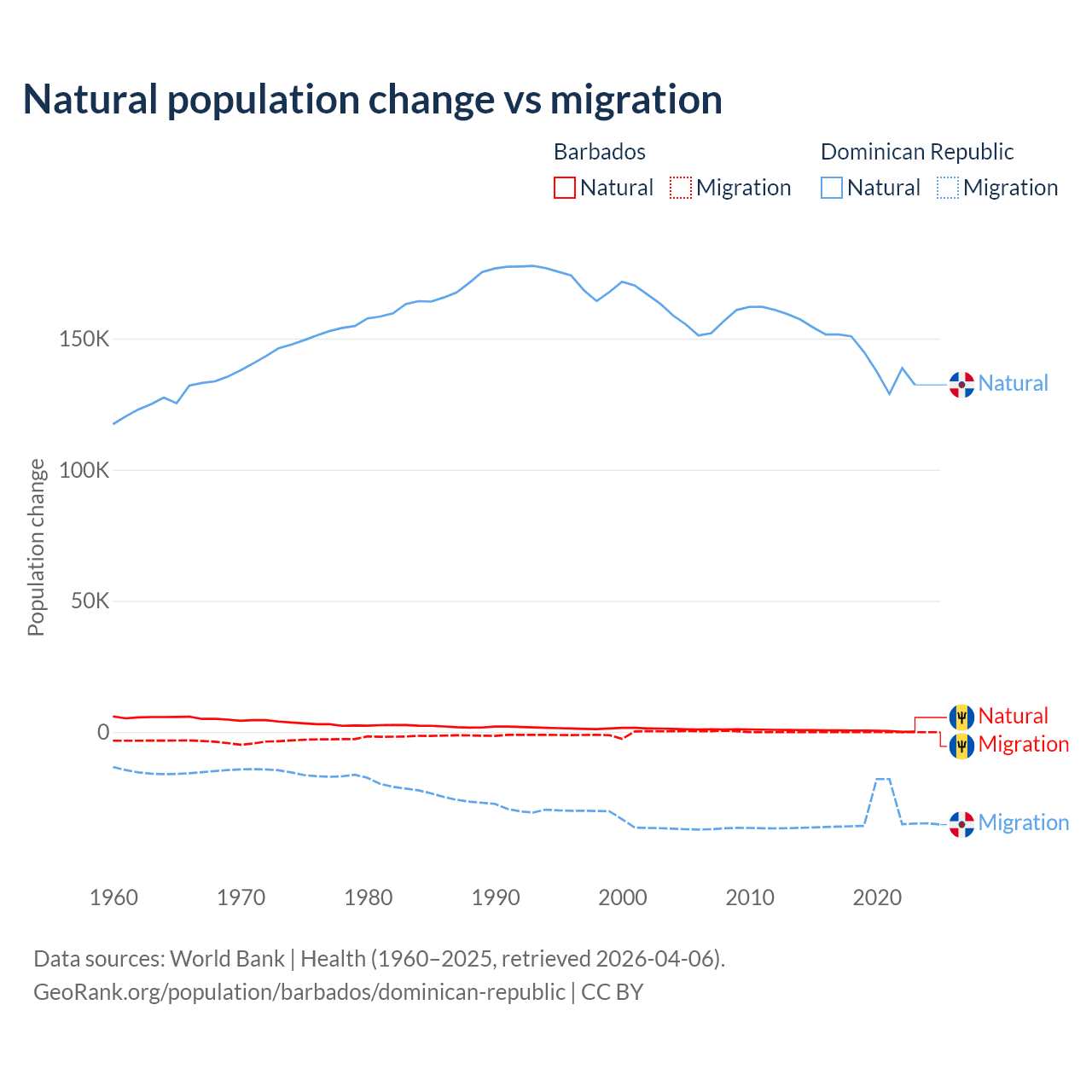 Over the last 10 years, 89.5% of the population change in Barbados is from natural causes (a gain of 4,936 people) and 10.5% is from migration (a loss of 578 people). In the Dominican Republic 81.8% is from natural causes (a gain of 1,447,764 people) and 18.2% is from migration (a loss of 322,919 people).