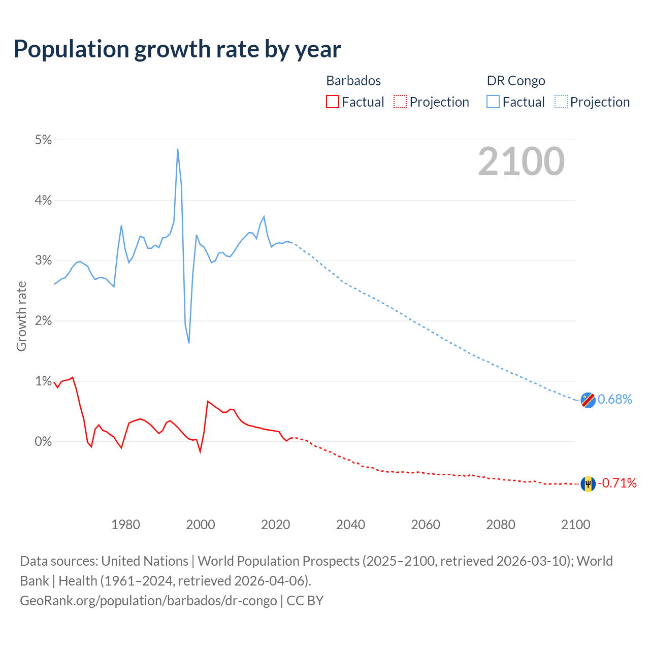 - For the last 10 years, Barbados has had an average growth rate of +0.16% per year vs +3.38% in the DR Congo.
