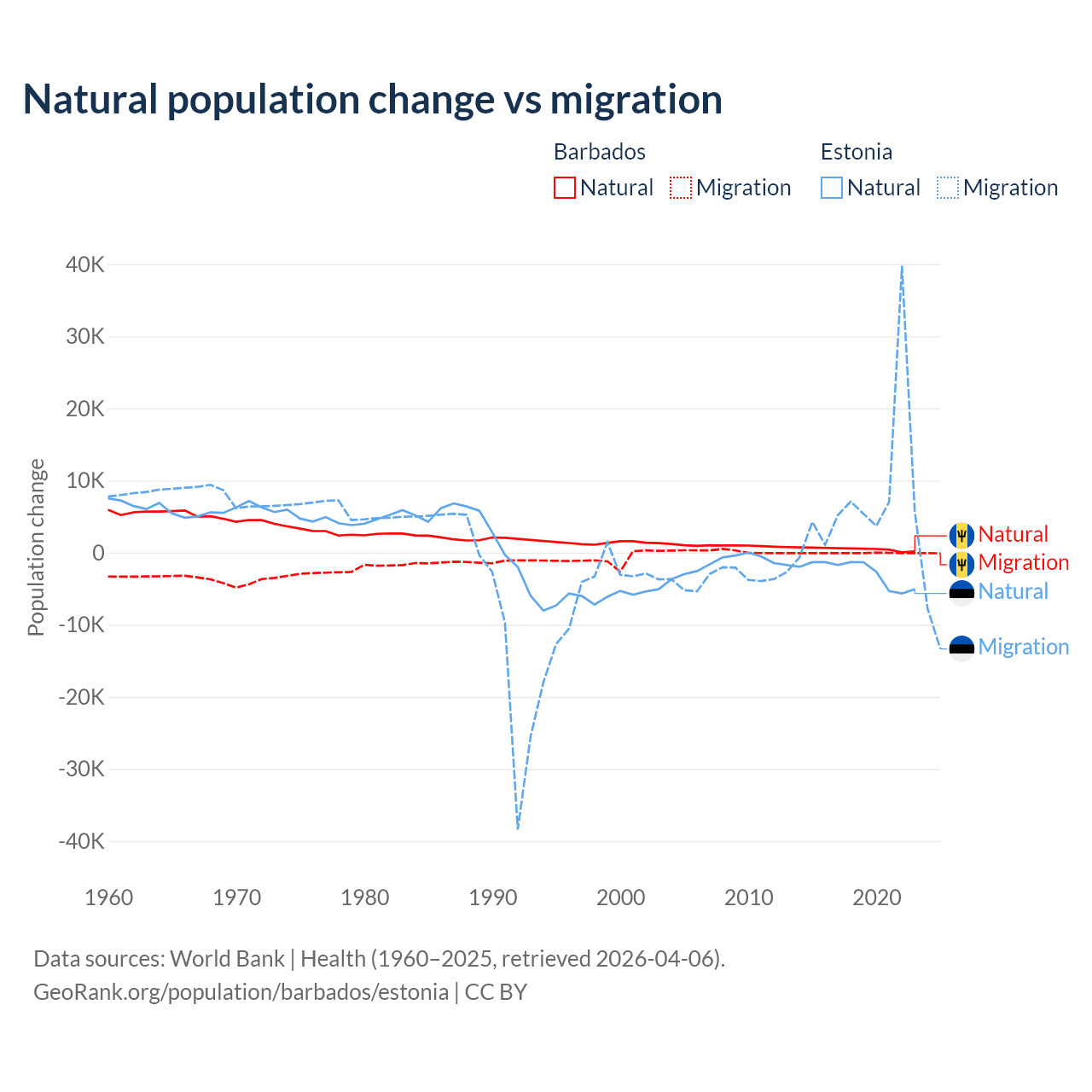 Over the last 10 years, 89.5% of the population change in Barbados is from natural causes (a gain of 4,936 people) and 10.5% is from migration (a loss of 578 people). In Estonia 26.1% is from natural causes (a loss of 27,683 people) and 73.9% is from migration (a gain of 78,553 people).