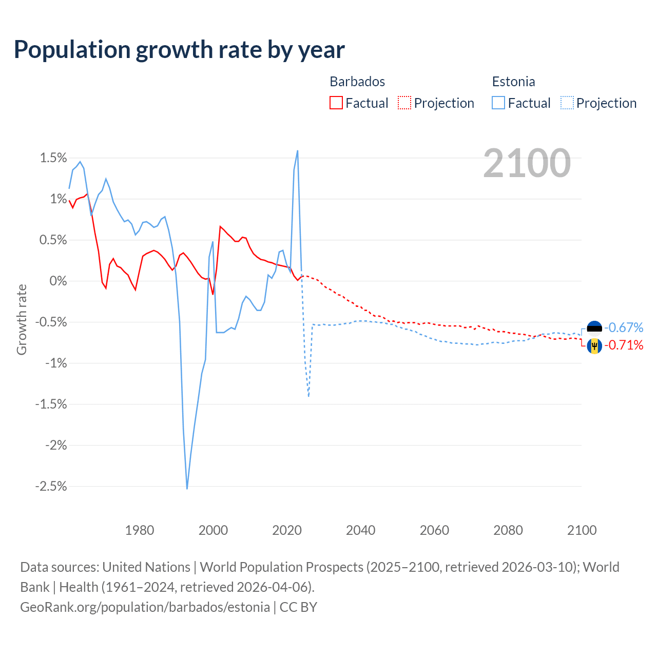 - Since 2006, the population of Barbados has increased from 270K people to 283K (4.74% growth), while Estonia has declined from 1.35M to 1.34M (0.54% decline).