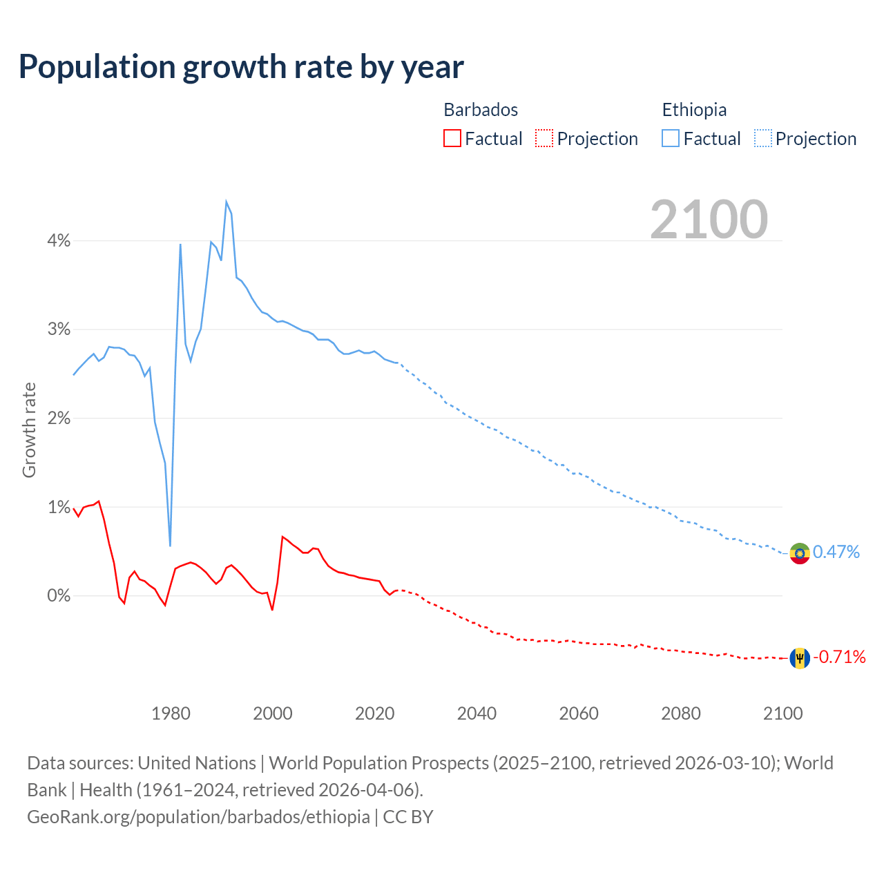- For the last 10 years, Barbados has had an average growth rate of +0.16% per year vs +2.71% in Ethiopia.