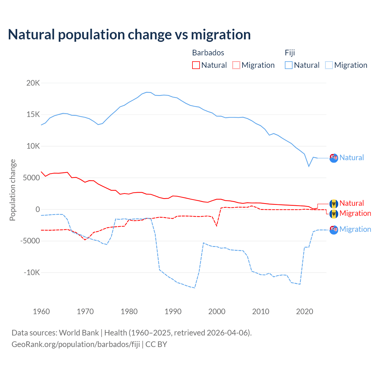 Over the last 10 years, 89.5% of the population change in Barbados is from natural causes (a gain of 4,936 people) and 10.5% is from migration (a loss of 578 people). In Fiji 52.6% is from natural causes (a gain of 94,971 people) and 47.4% is from migration (a loss of 85,415 people).