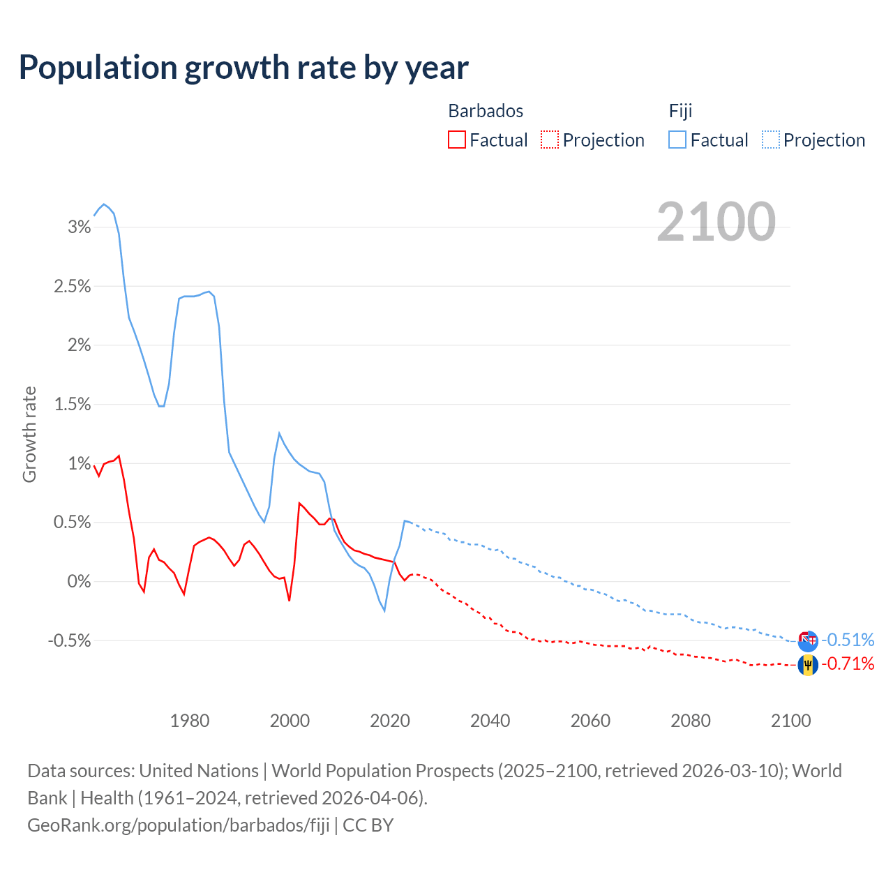 - For the last 10 years, Barbados has had an average growth rate of +0.16% per year vs +0.12% in Fiji.