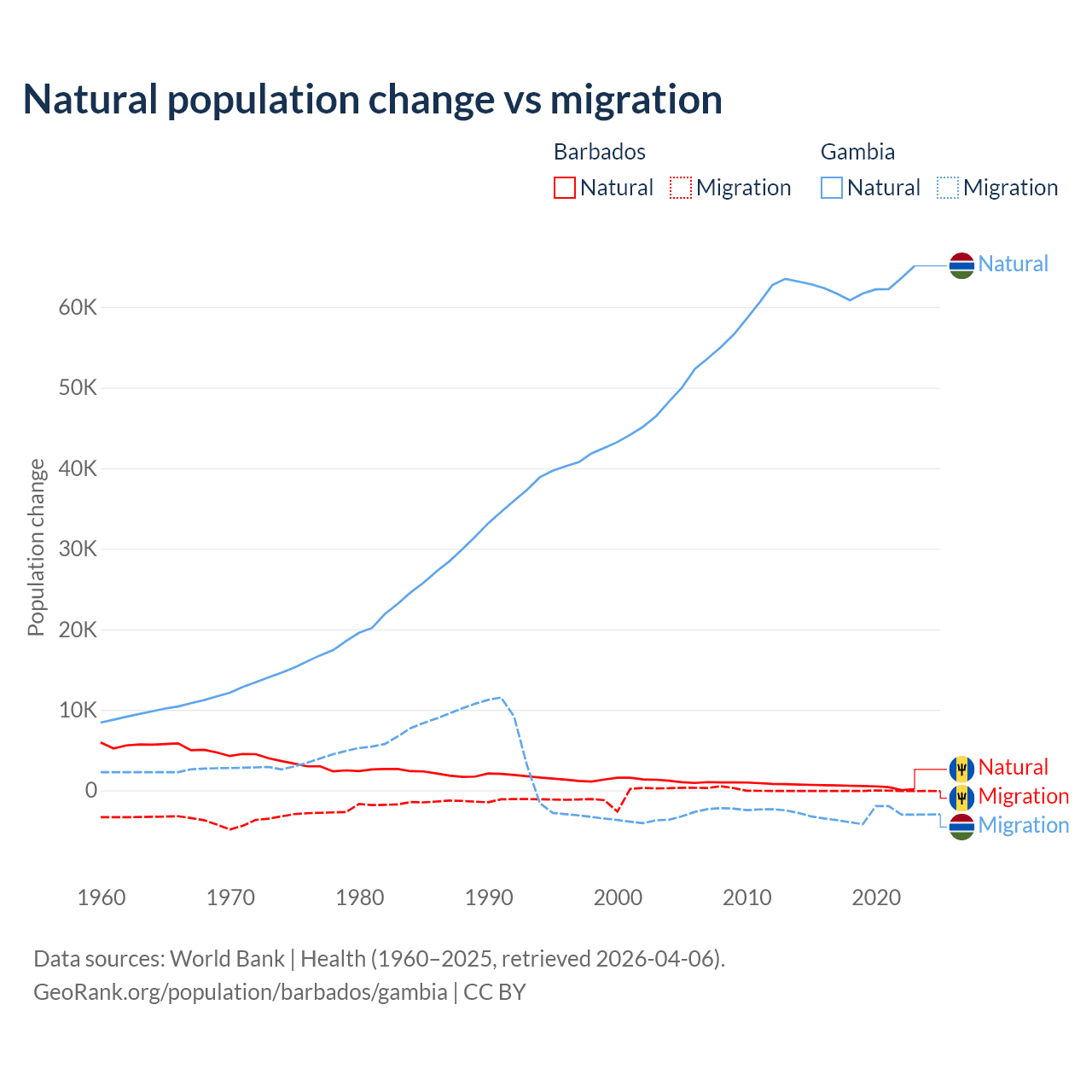 Over the last 10 years, 89.5% of the population change in Barbados is from natural causes (a gain of 4,936 people) and 10.5% is from migration (a loss of 578 people). In the Gambia 95.2% is from natural causes (a gain of 625,795 people) and 4.75% is from migration (a loss of 31,227 people).