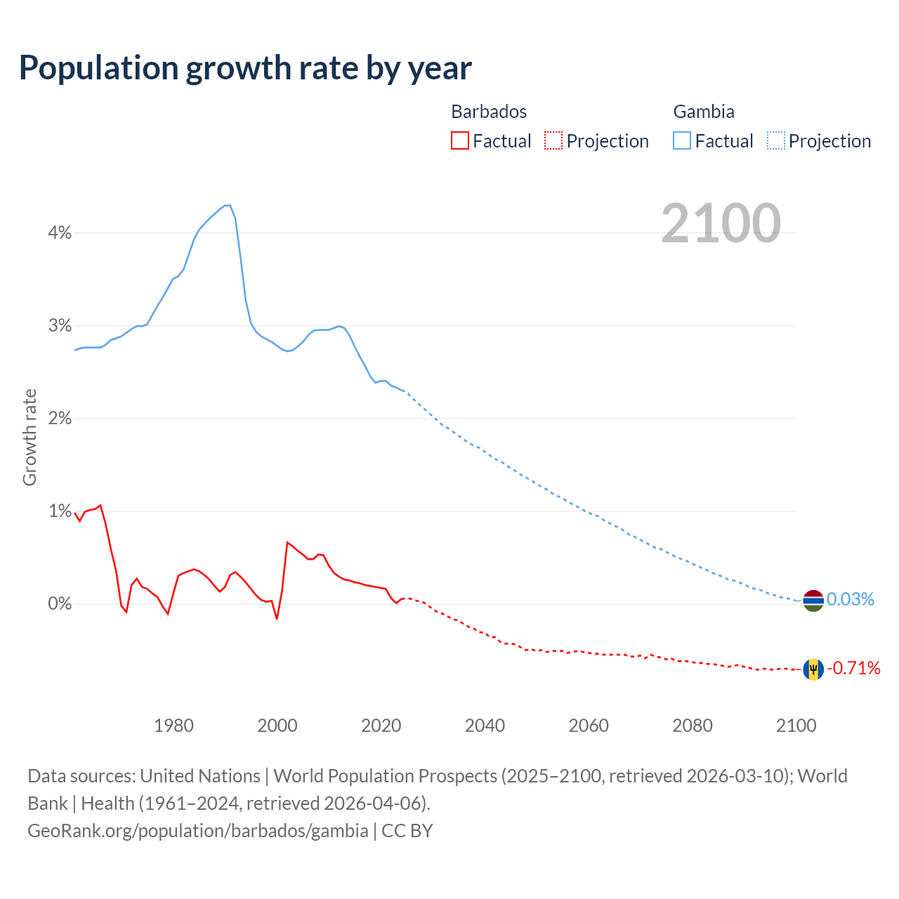 - For the last 10 years, Barbados has had an average growth rate of +0.16% per year vs +2.5% in the Gambia.