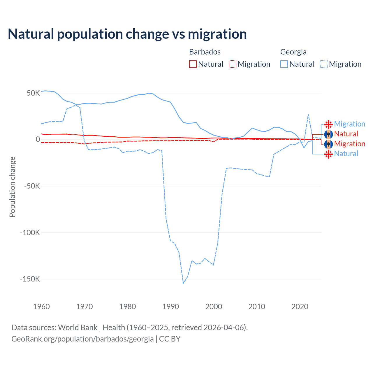 Over the last 10 years, 89.5% of the population change in Barbados is from natural causes (a gain of 4,936 people) and 10.5% is from migration (a loss of 578 people). In Georgia 57.7% is from natural causes (a gain of 47,646 people) and 42.3% is from migration (a loss of 34,907 people).