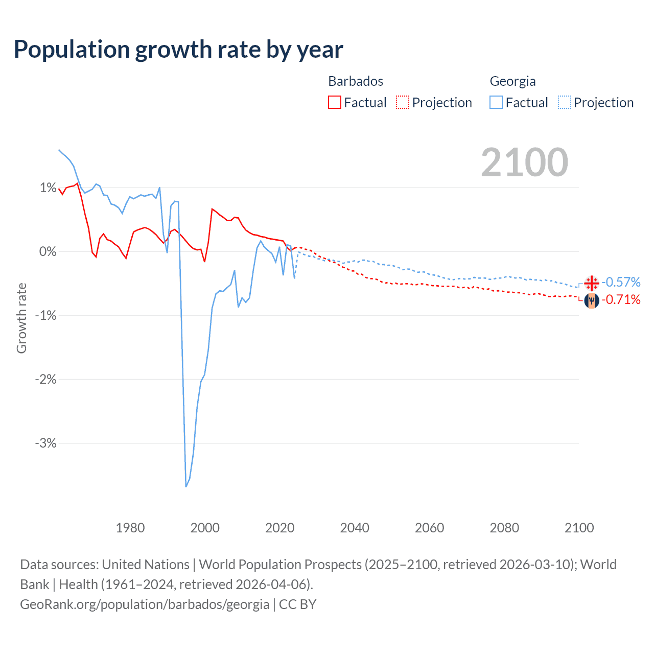 - For the last 10 years, Barbados has had an average growth rate of +0.16% per year vs -0.04% in Georgia.