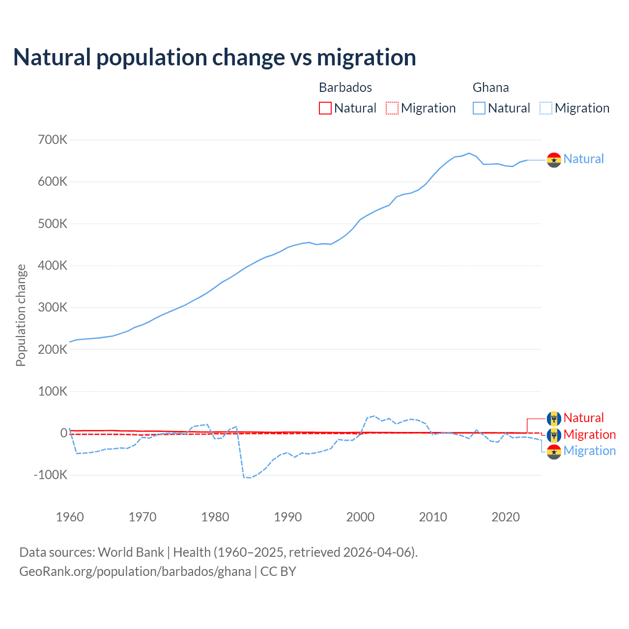 Over the last 10 years, 89.5% of the population change in Barbados is from natural causes (a gain of 4,936 people) and 10.5% is from migration (a loss of 578 people). In Ghana 98.6% is from natural causes (a gain of 6,484,449 people) and 1.37% is from migration (a loss of 90,310 people).