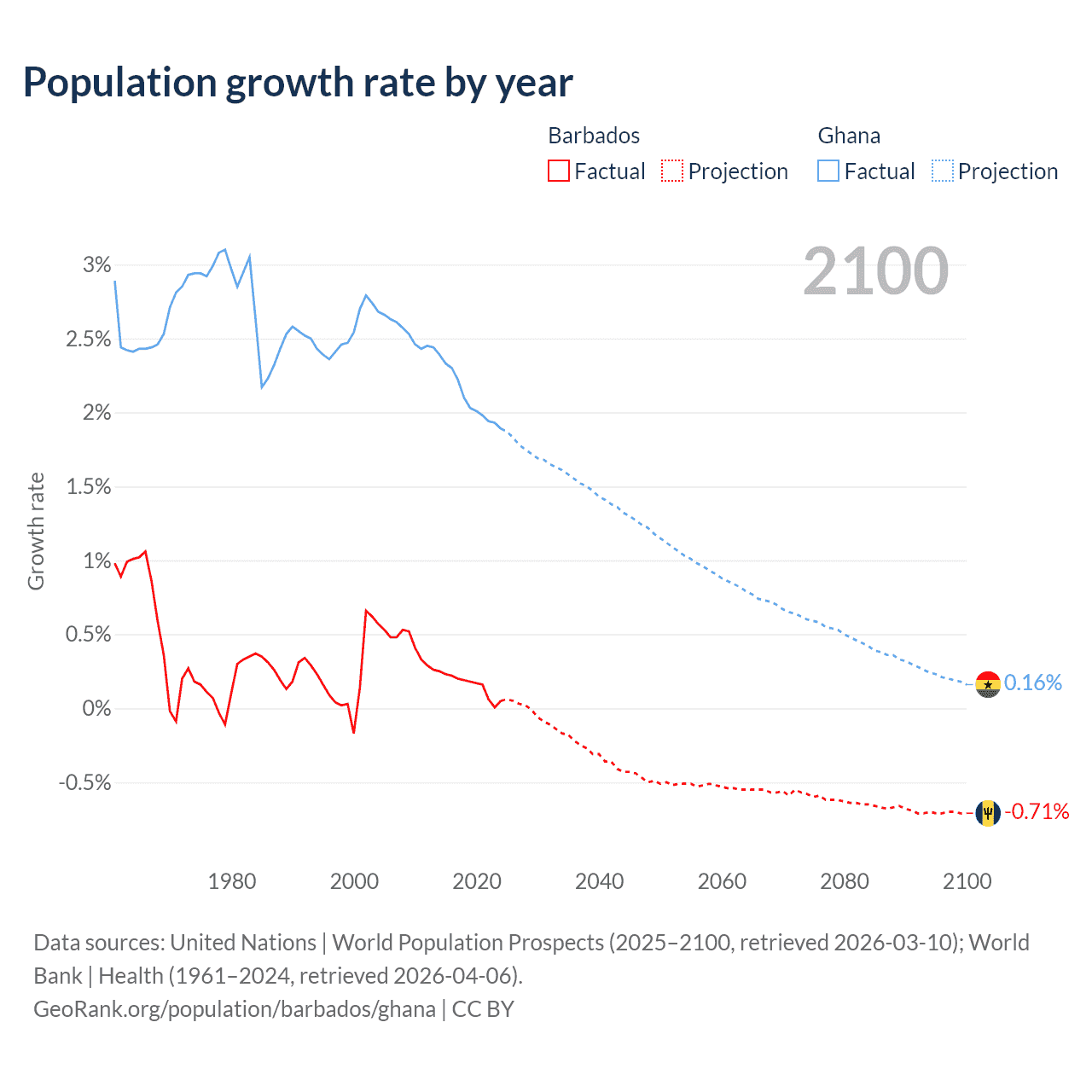- For the last 10 years, Barbados has had an average growth rate of +0.16% per year vs +2.1% in Ghana.