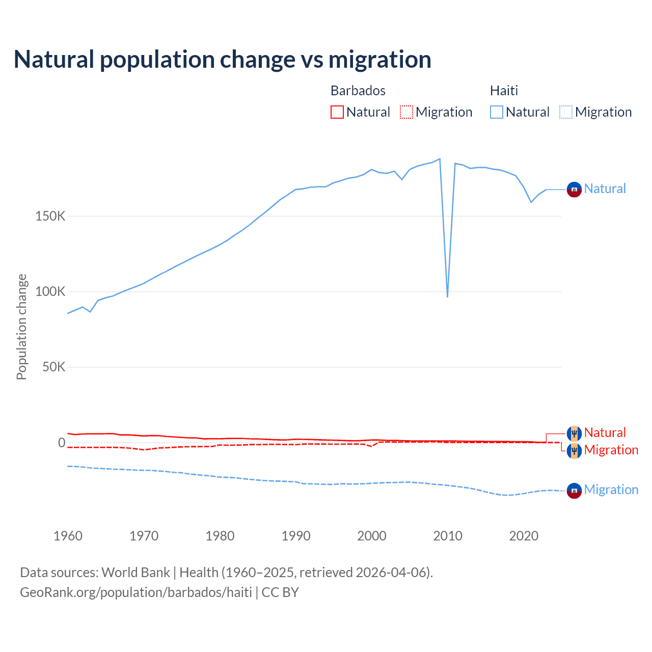 Over the last 10 years, 89.5% of the population change in Barbados is from natural causes (a gain of 4,936 people) and 10.5% is from migration (a loss of 578 people). In Haiti 83.9% is from natural causes (a gain of 1,740,319 people) and 16.1% is from migration (a loss of 333,076 people).