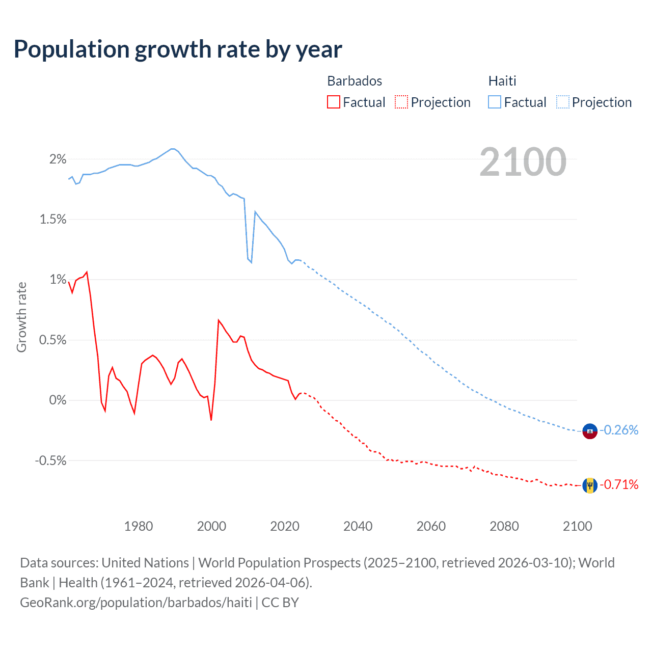 - For the last 10 years, Barbados has had an average growth rate of +0.16% per year vs +1.29% in Haiti.