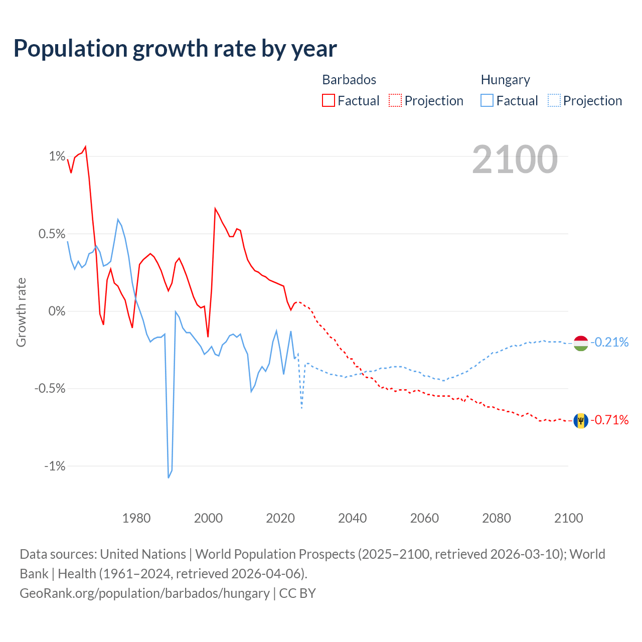- For the last 10 years, Barbados has had an average growth rate of +0.16% per year vs -0.29% in Hungary.