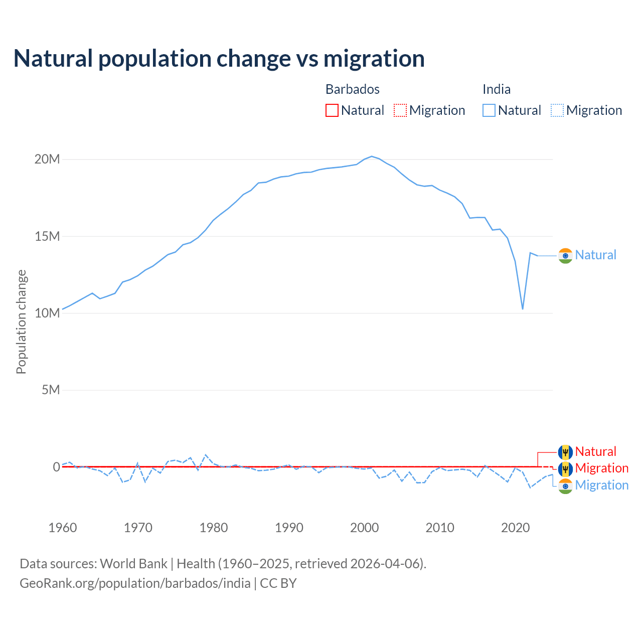 Over the last 10 years, 89.5% of the population change in Barbados is from natural causes (a gain of 4,936 people) and 10.5% is from migration (a loss of 578 people). In India 96.4% is from natural causes (a gain of 145,503,378 people) and 3.56% is from migration (a loss of 5,376,884 people).