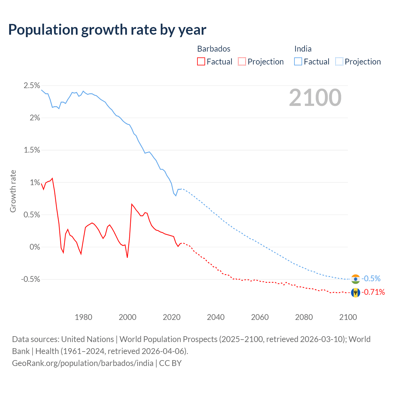 - For the last 10 years, Barbados has had an average growth rate of +0.16% per year vs +1.03% in India.