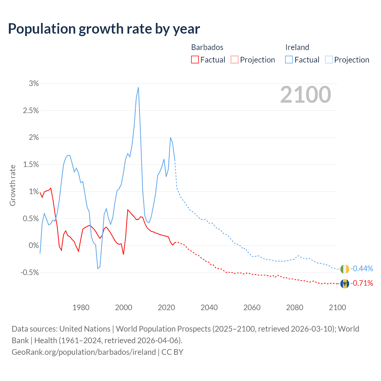 - For the last 10 years, Barbados has had an average growth rate of +0.16% per year vs +1.41% in Ireland.