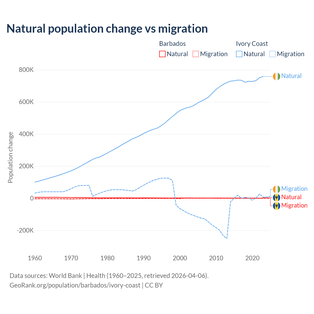 Over the last 10 years, 89.5% of the population change in Barbados is from natural causes (a gain of 4,936 people) and 10.5% is from migration (a loss of 578 people). In Ivory Coast 99.7% is from natural causes (a gain of 7,348,944 people) and 0.33% is from migration (a gain of 24,432 people).
