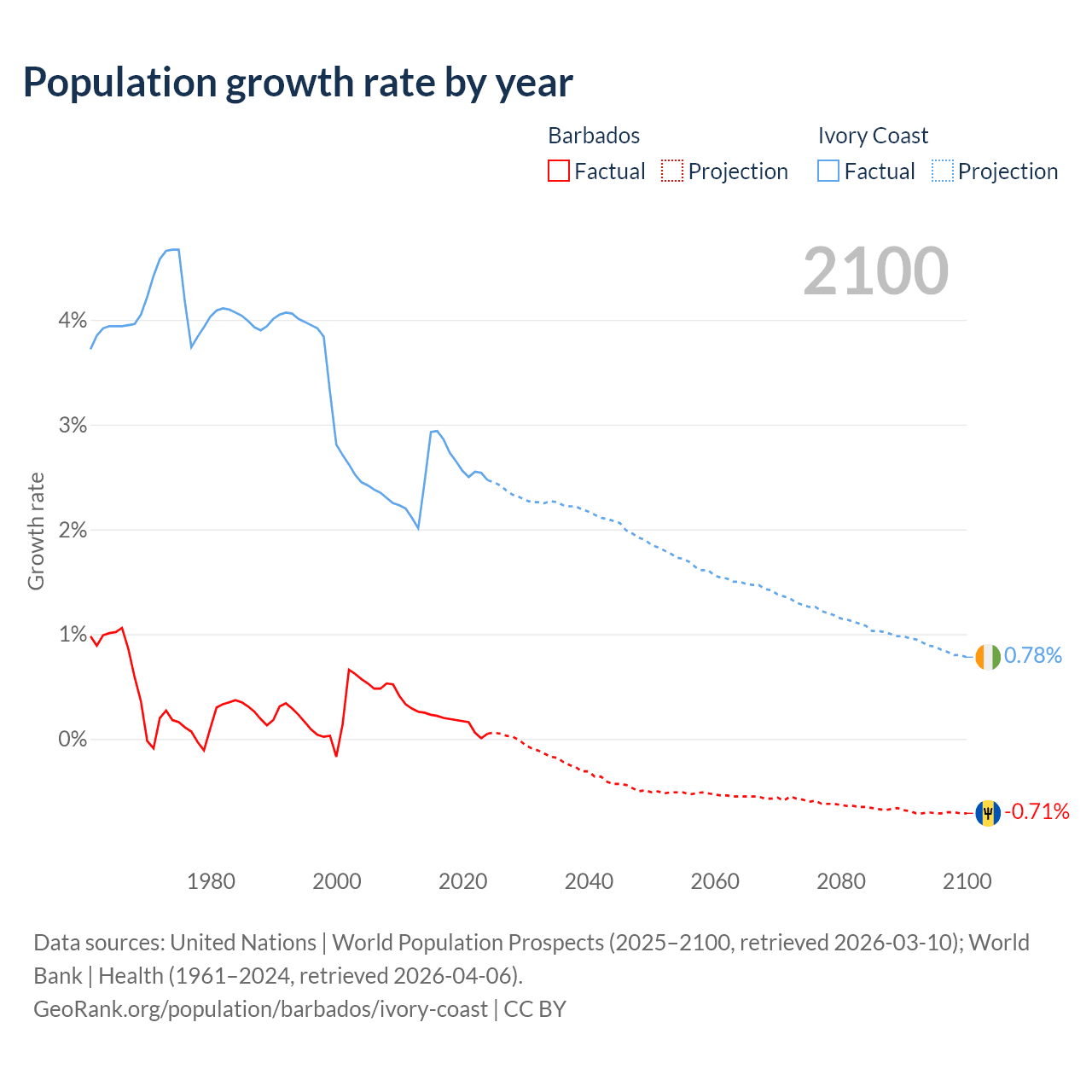 - For the last 10 years, Barbados has had an average growth rate of +0.16% per year vs +2.65% in Ivory Coast.