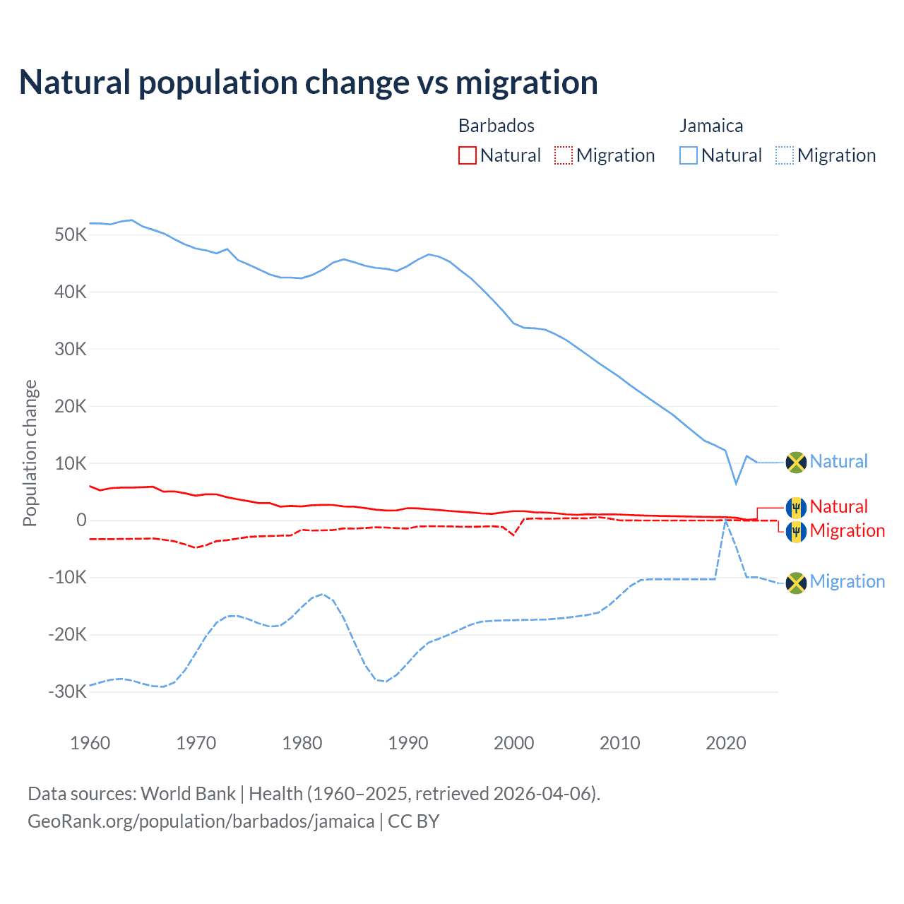 Over the last 10 years, 89.5% of the population change in Barbados is from natural causes (a gain of 4,936 people) and 10.5% is from migration (a loss of 578 people). In Jamaica 61.3% is from natural causes (a gain of 137,465 people) and 38.7% is from migration (a loss of 86,681 people).