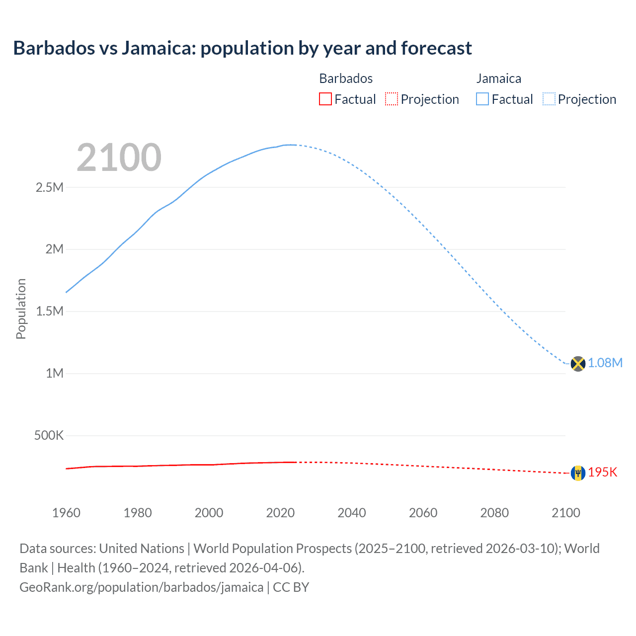 Barbados vs Jamaica: population by year and forecast