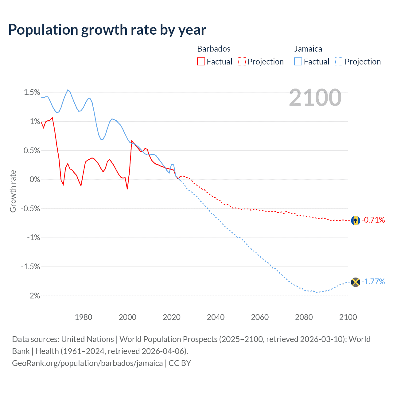 - For the last 10 years, Barbados has had an average growth rate of +0.16% per year vs +0.18% in Jamaica.