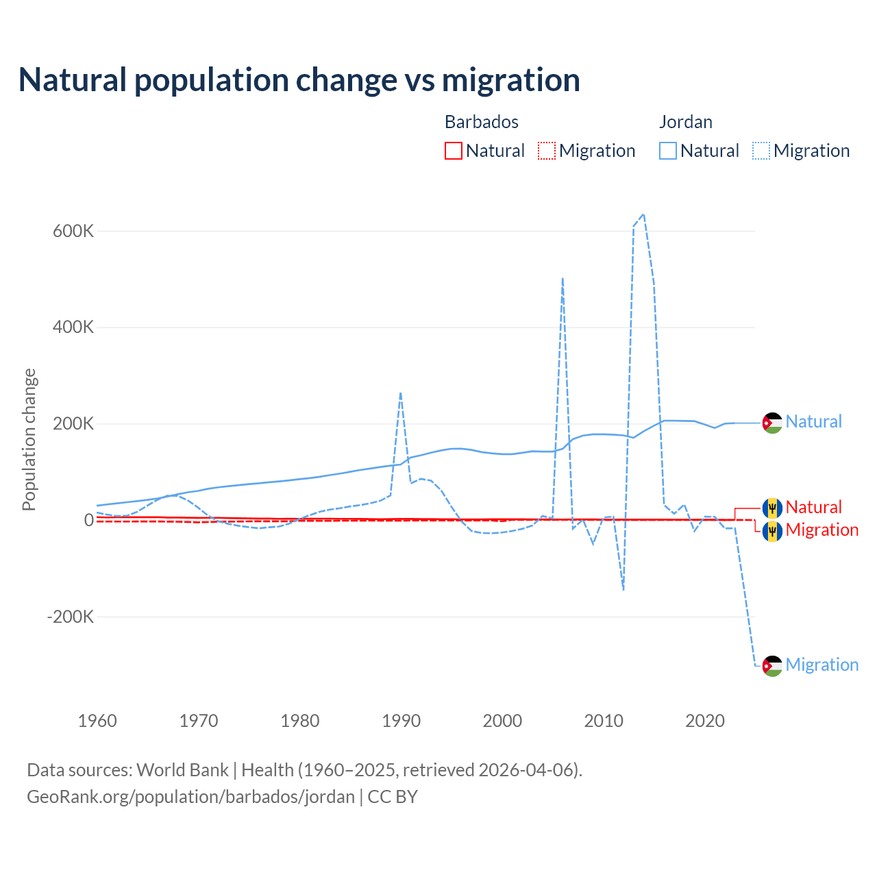 Over the last 10 years, 89.5% of the population change in Barbados is from natural causes (a gain of 4,936 people) and 10.5% is from migration (a loss of 578 people). In Jordan 63.2% is from natural causes (a gain of 1,991,452 people) and 36.8% is from migration (a gain of 1,157,625 people).