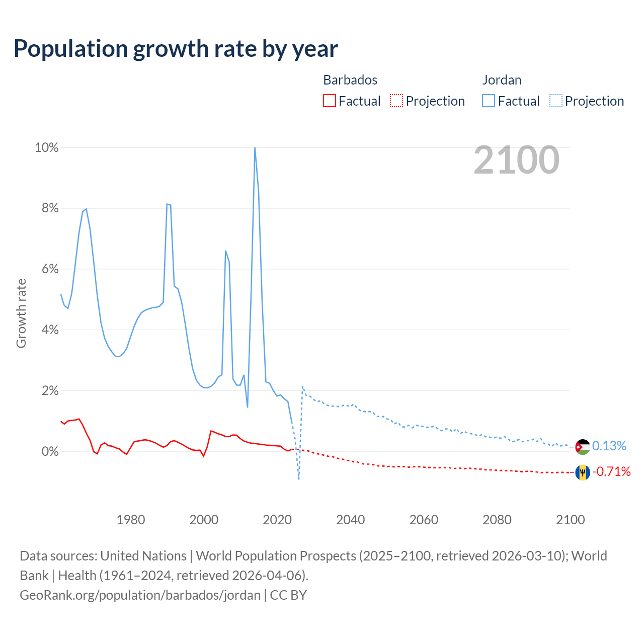 - For the last 10 years, Barbados has had an average growth rate of +0.16% per year vs +3.45% in Jordan.