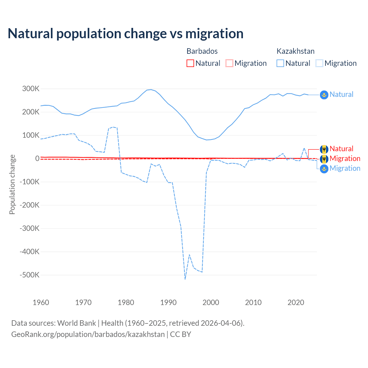 Over the last 10 years, 89.5% of the population change in Barbados is from natural causes (a gain of 4,936 people) and 10.5% is from migration (a loss of 578 people). In Kazakhstan 98.7% is from natural causes (a gain of 2,743,094 people) and 1.33% is from migration (a gain of 36,908 people).