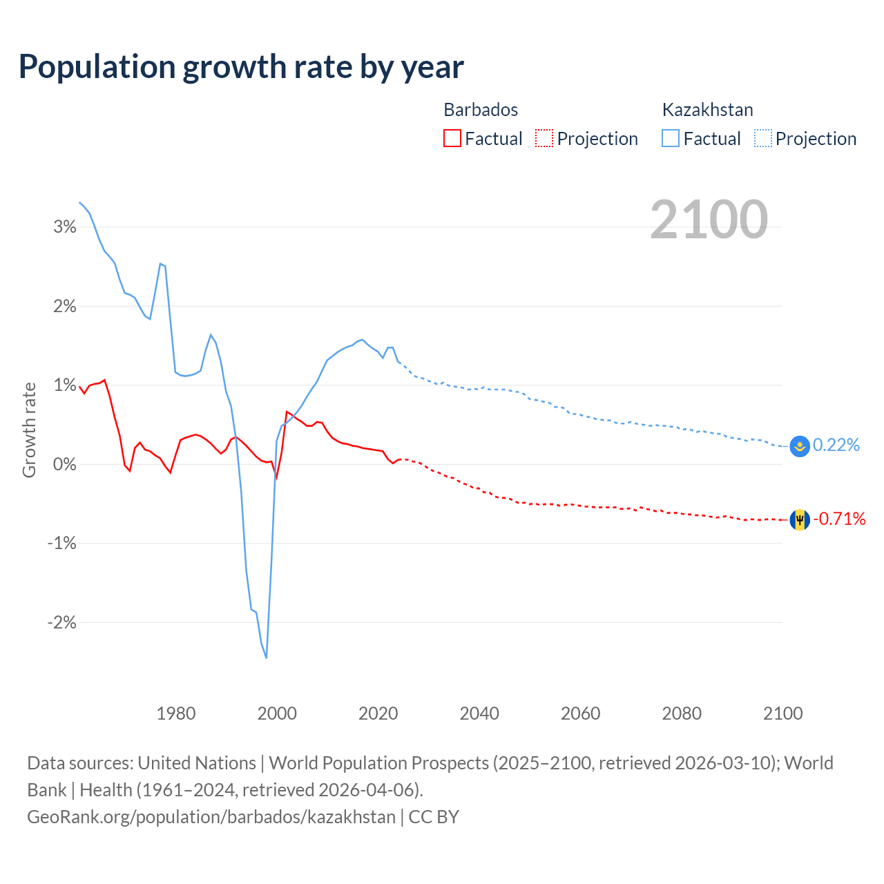 - For the last 10 years, Barbados has had an average growth rate of +0.16% per year vs +1.46% in Kazakhstan.