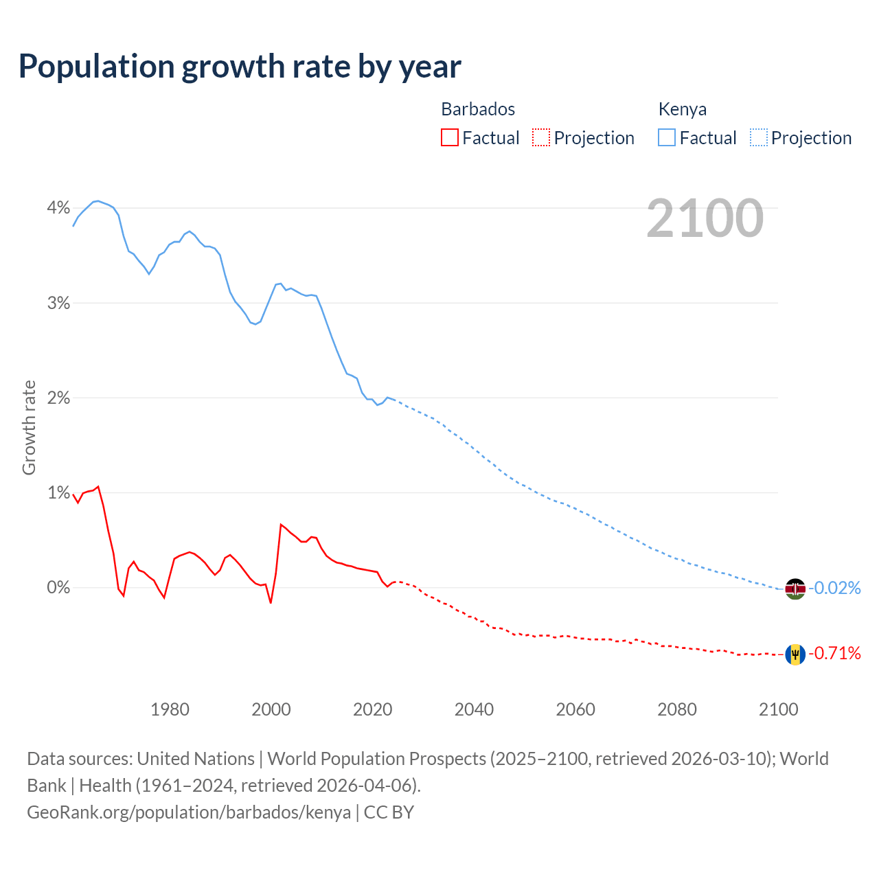 - For the last 10 years, Barbados has had an average growth rate of +0.16% per year vs +2.08% in Kenya.