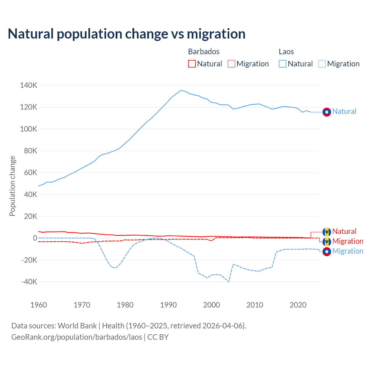 Over the last 10 years, 89.5% of the population change in Barbados is from natural causes (a gain of 4,936 people) and 10.5% is from migration (a loss of 578 people). In Laos 90.6% is from natural causes (a gain of 1,183,013 people) and 9.41% is from migration (a loss of 122,899 people).