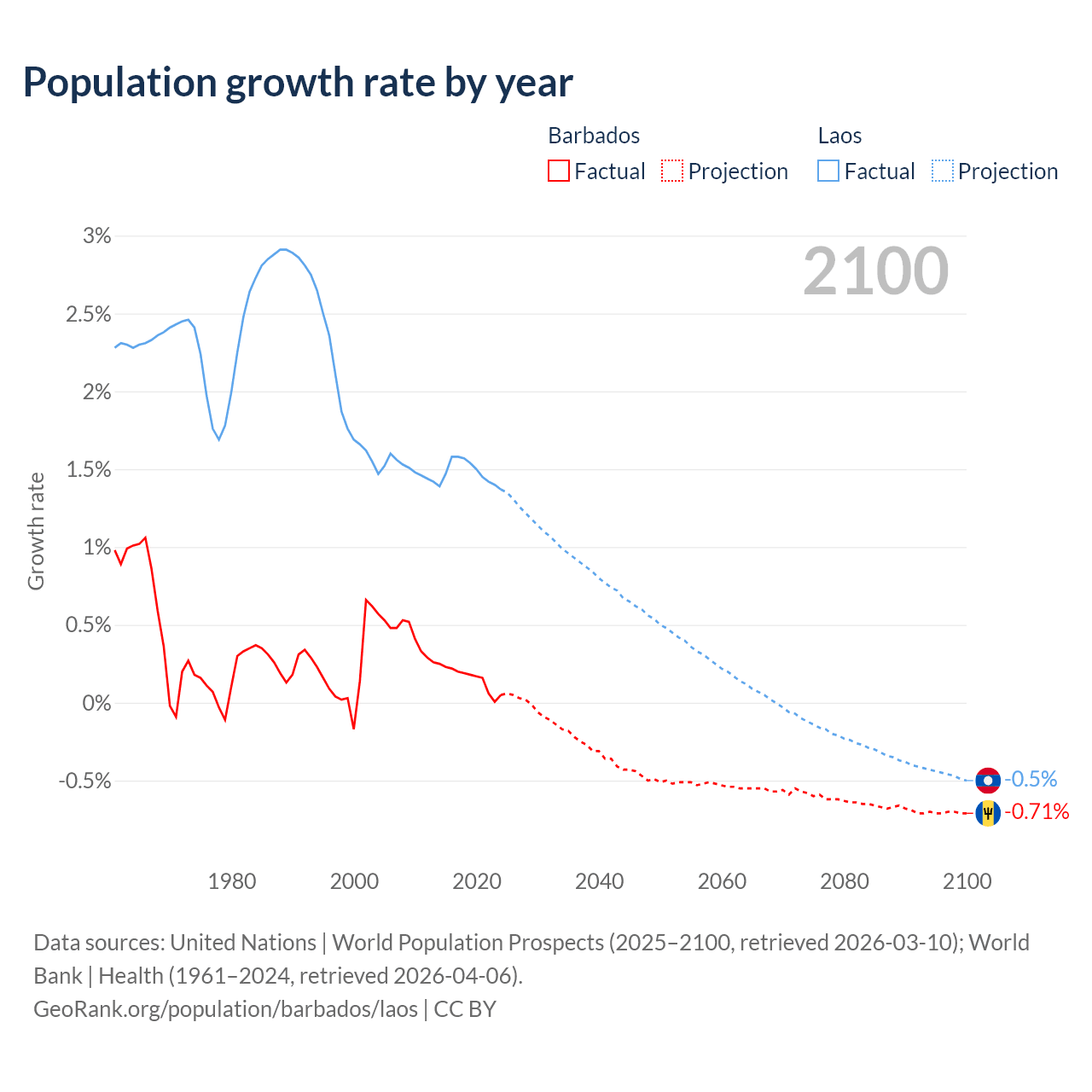 - For the last 10 years, Barbados has had an average growth rate of +0.16% per year vs +1.48% in Laos.