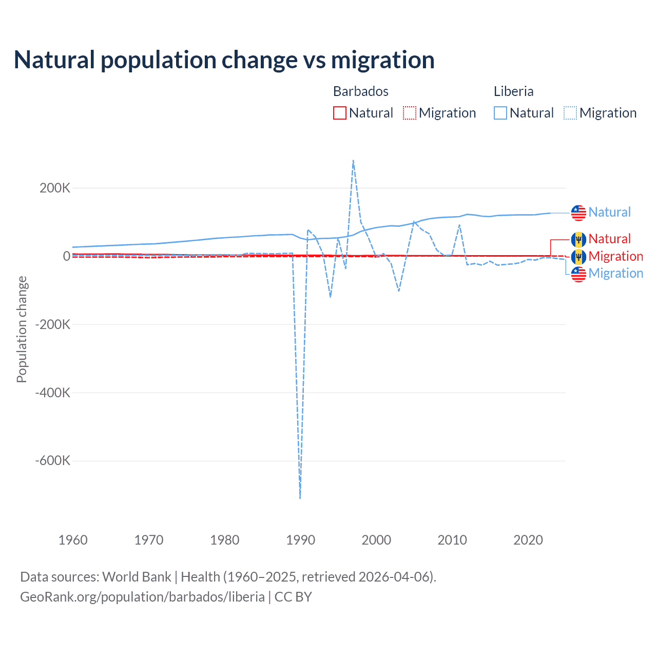 Over the last 10 years, 89.5% of the population change in Barbados is from natural causes (a gain of 4,936 people) and 10.5% is from migration (a loss of 578 people). In Liberia 87.7% is from natural causes (a gain of 1,202,387 people) and 12.3% is from migration (a loss of 168,316 people).