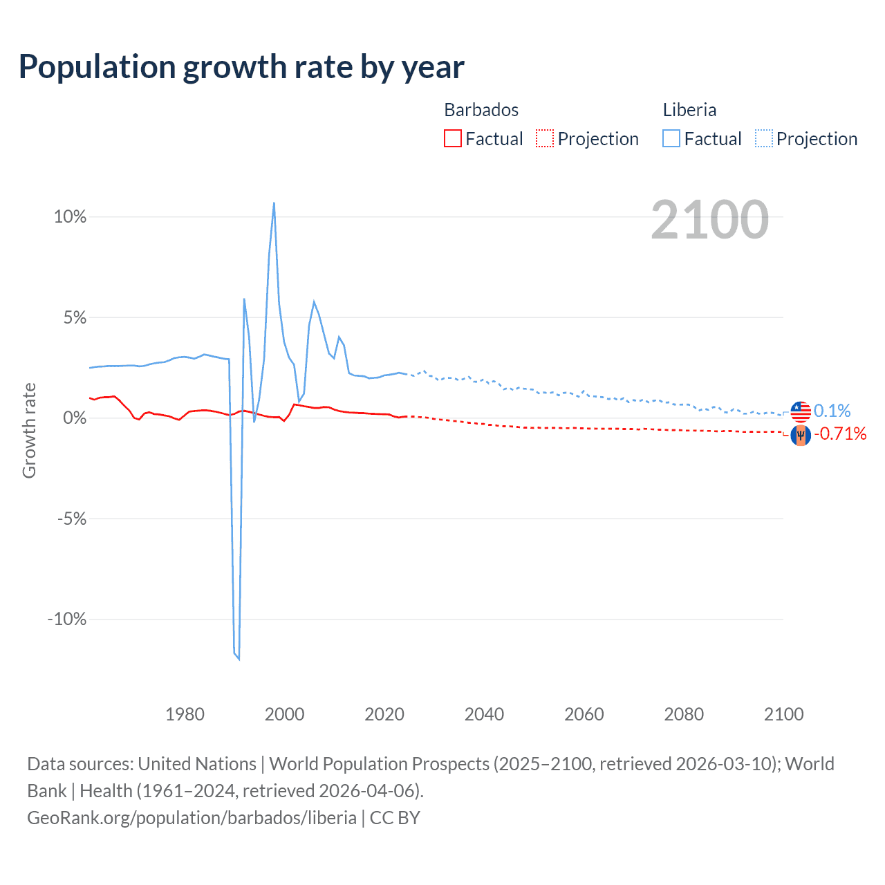 - For the last 10 years, Barbados has had an average growth rate of +0.16% per year vs +2.09% in Liberia.