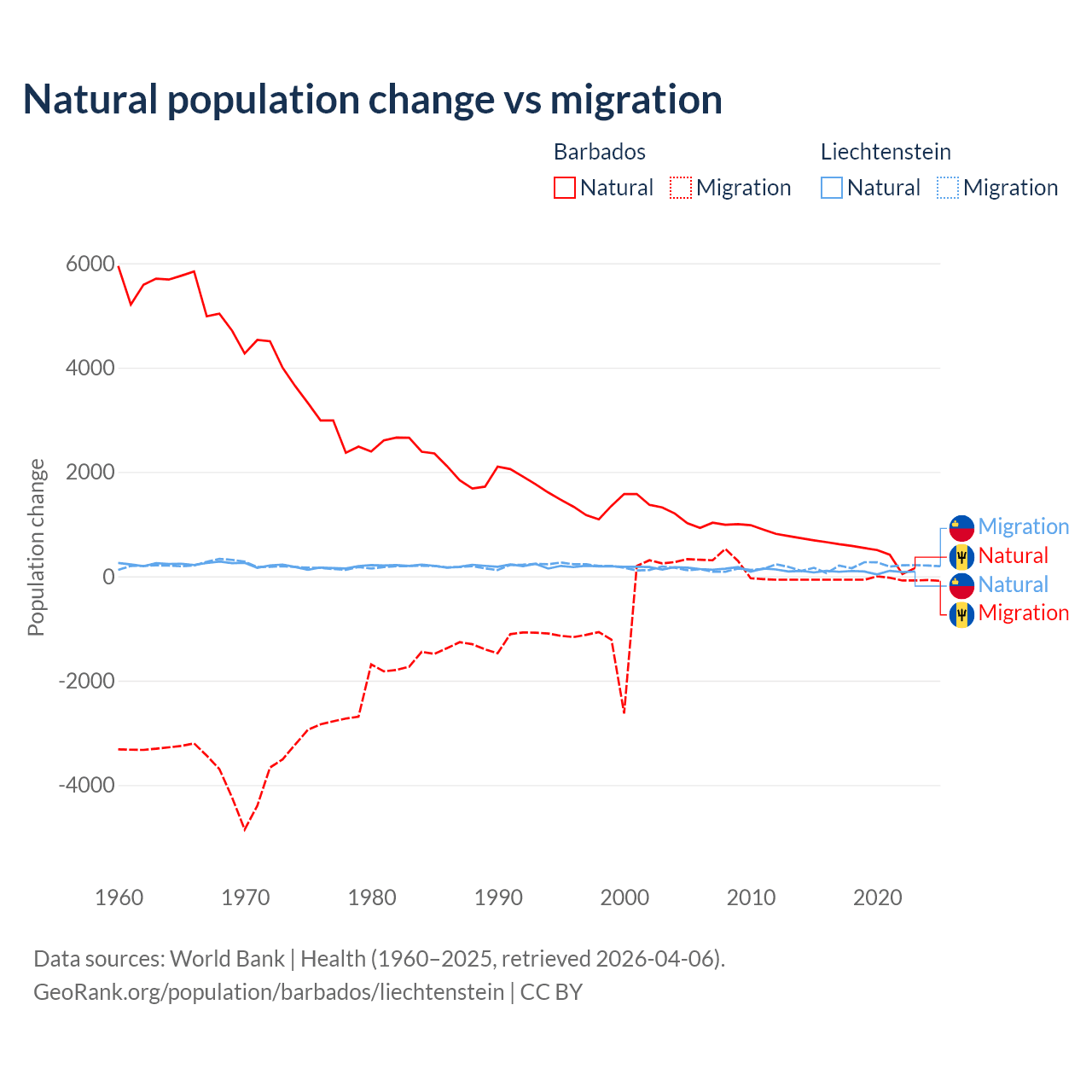 Over the last 10 years, 89.5% of the population change in Barbados is from natural causes (a gain of 4,936 people) and 10.5% is from migration (a loss of 578 people). In Liechtenstein 32.4% is from natural causes (a gain of 883 people) and 67.6% is from migration (a gain of 1,843 people).