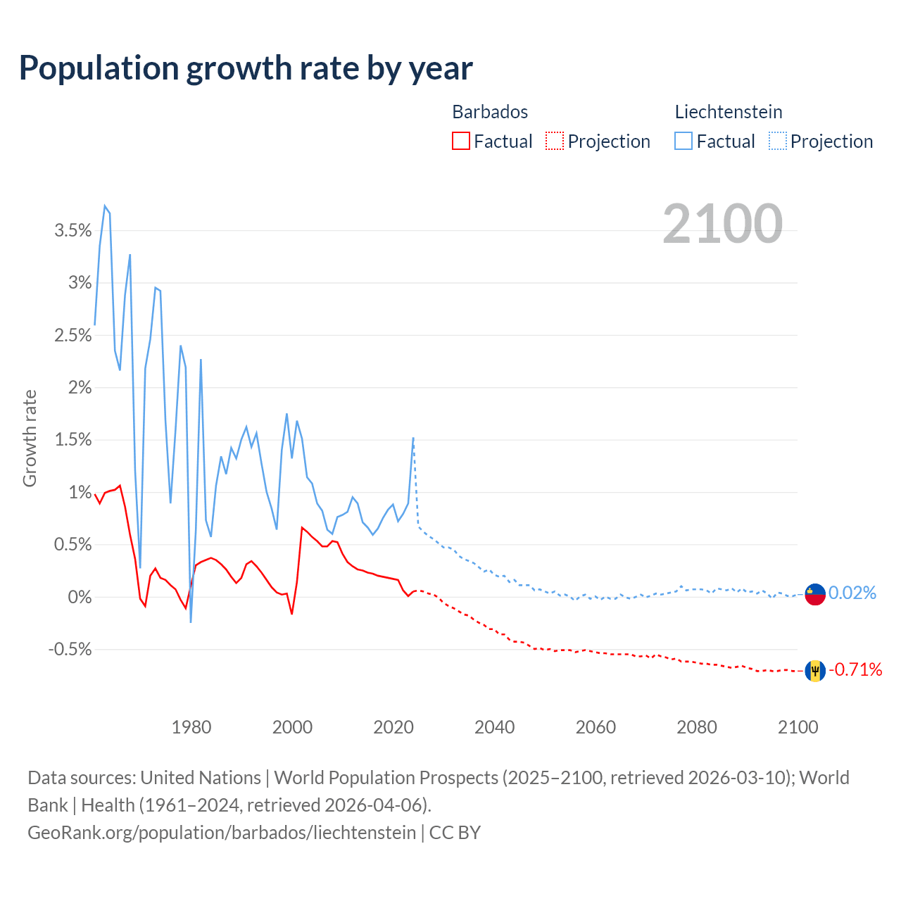 - For the last 10 years, Barbados has had an average growth rate of +0.16% per year vs +0.82% in Liechtenstein.