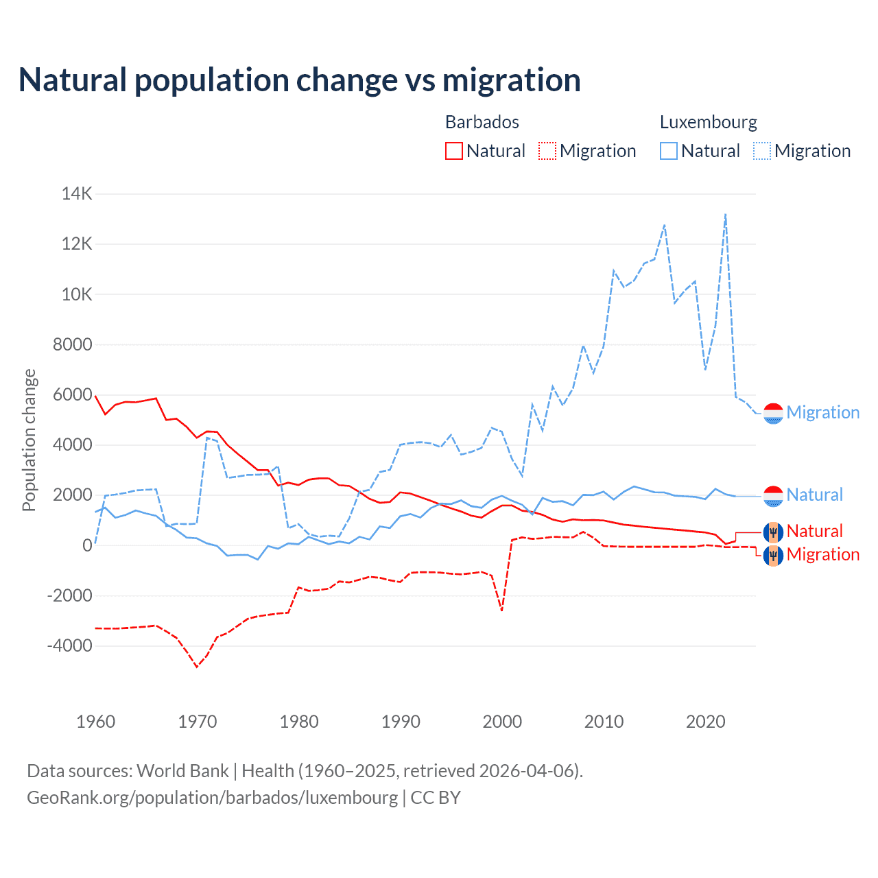 Over the last 10 years, 89.5% of the population change in Barbados is from natural causes (a gain of 4,936 people) and 10.5% is from migration (a loss of 578 people). In Luxembourg 16.8% is from natural causes (a gain of 20,287 people) and 83.2% is from migration (a gain of 100,435 people).