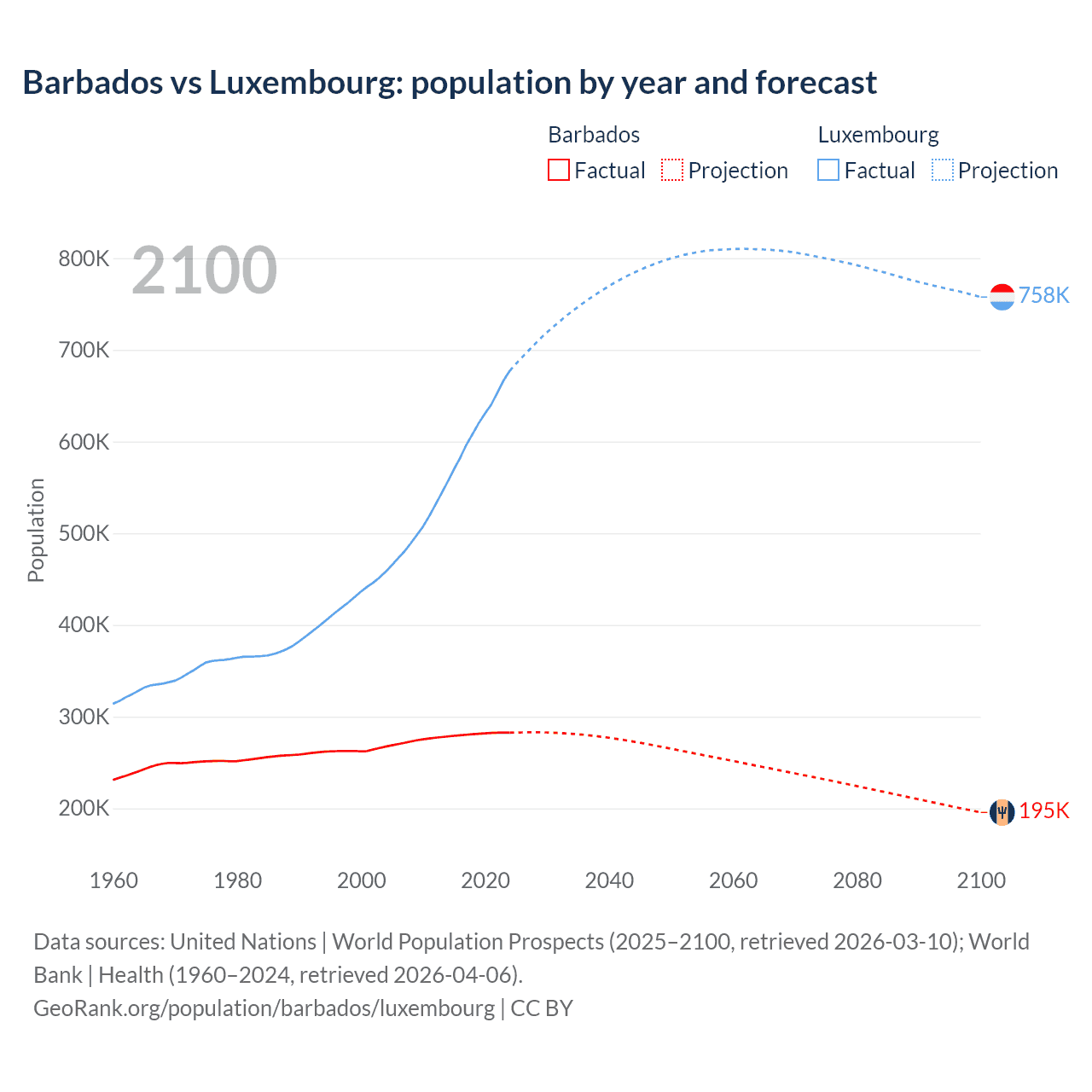 Barbados vs Luxembourg: population by year and forecast