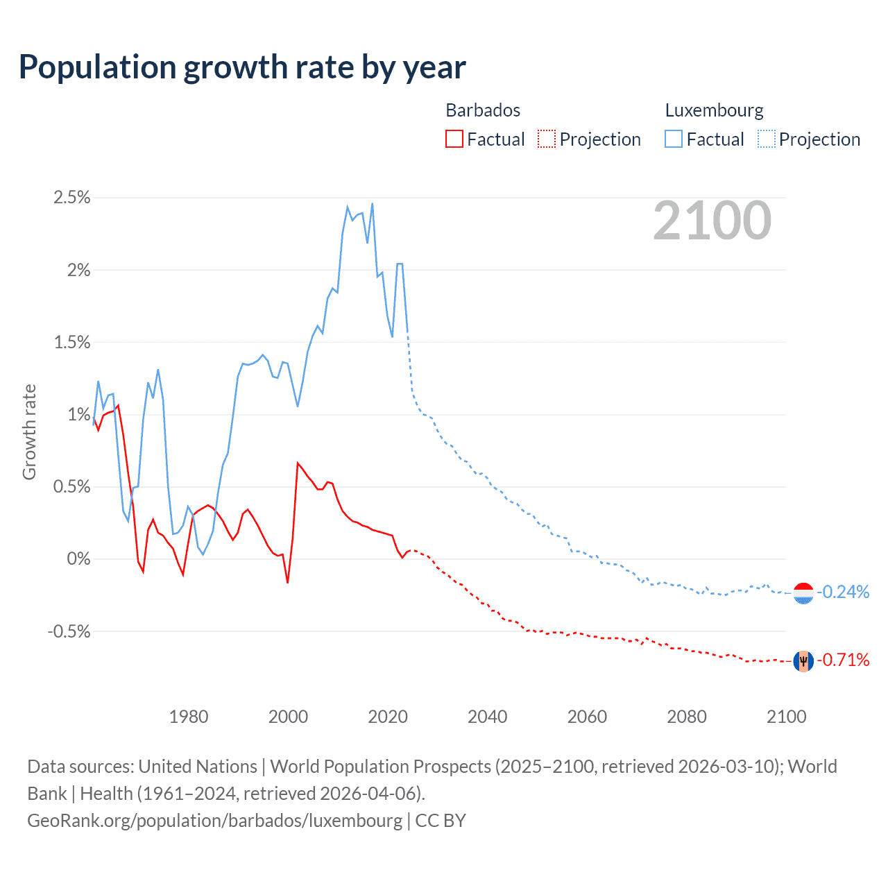 - For the last 10 years, Barbados has had an average growth rate of +0.16% per year vs +2.02% in Luxembourg.