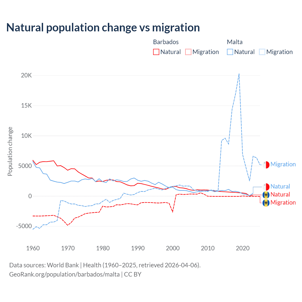 Over the last 10 years, 89.5% of the population change in Barbados is from natural causes (a gain of 4,936 people) and 10.5% is from migration (a loss of 578 people). In Malta 5.84% is from natural causes (a gain of 6,181 people) and 94.2% is from migration (a gain of 99,652 people).