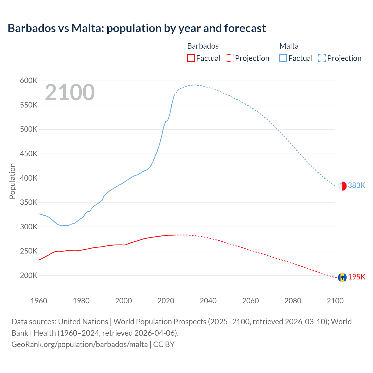 Barbados vs Malta: population by year and forecast