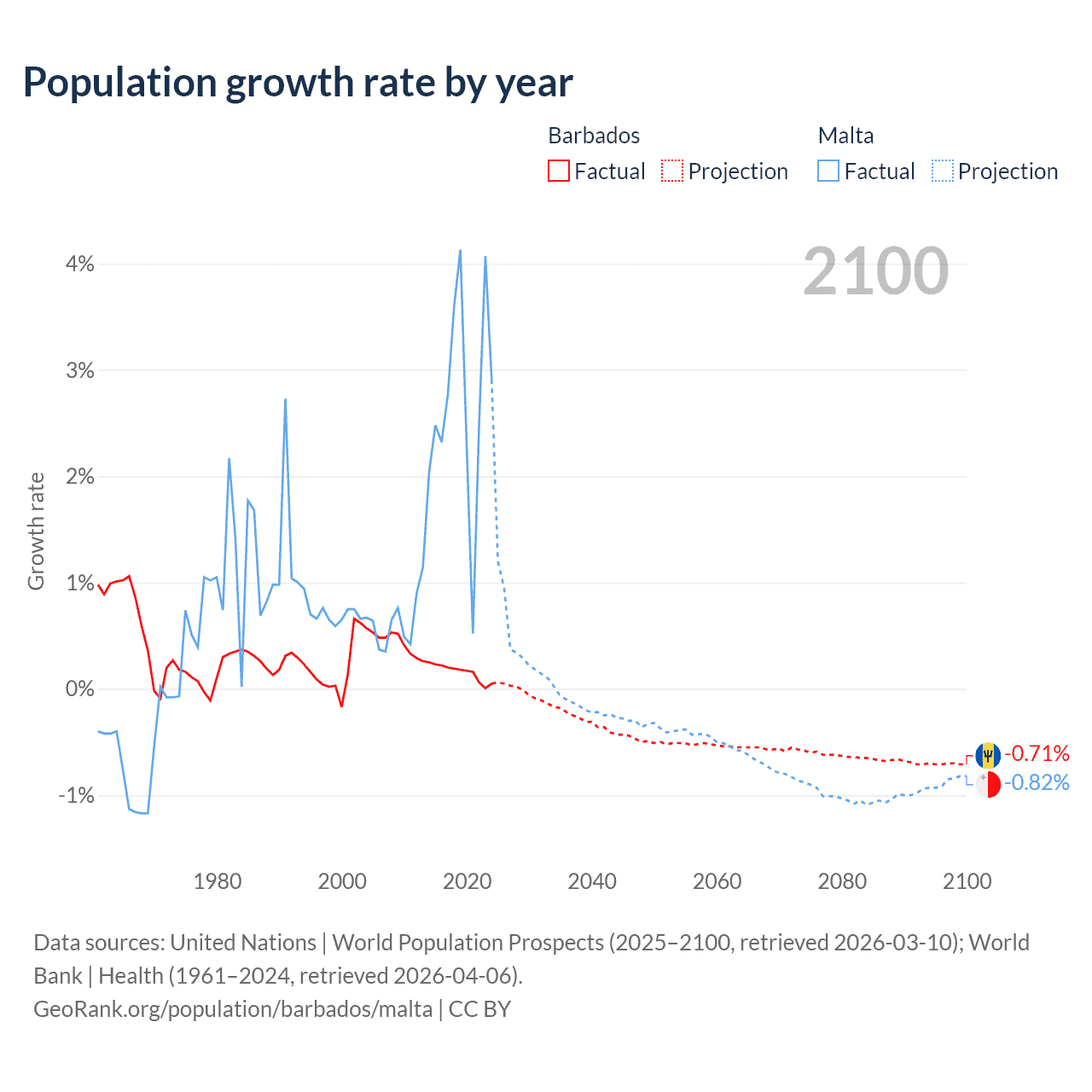 - For the last 10 years, Barbados has had an average growth rate of +0.16% per year vs +2.69% in Malta.