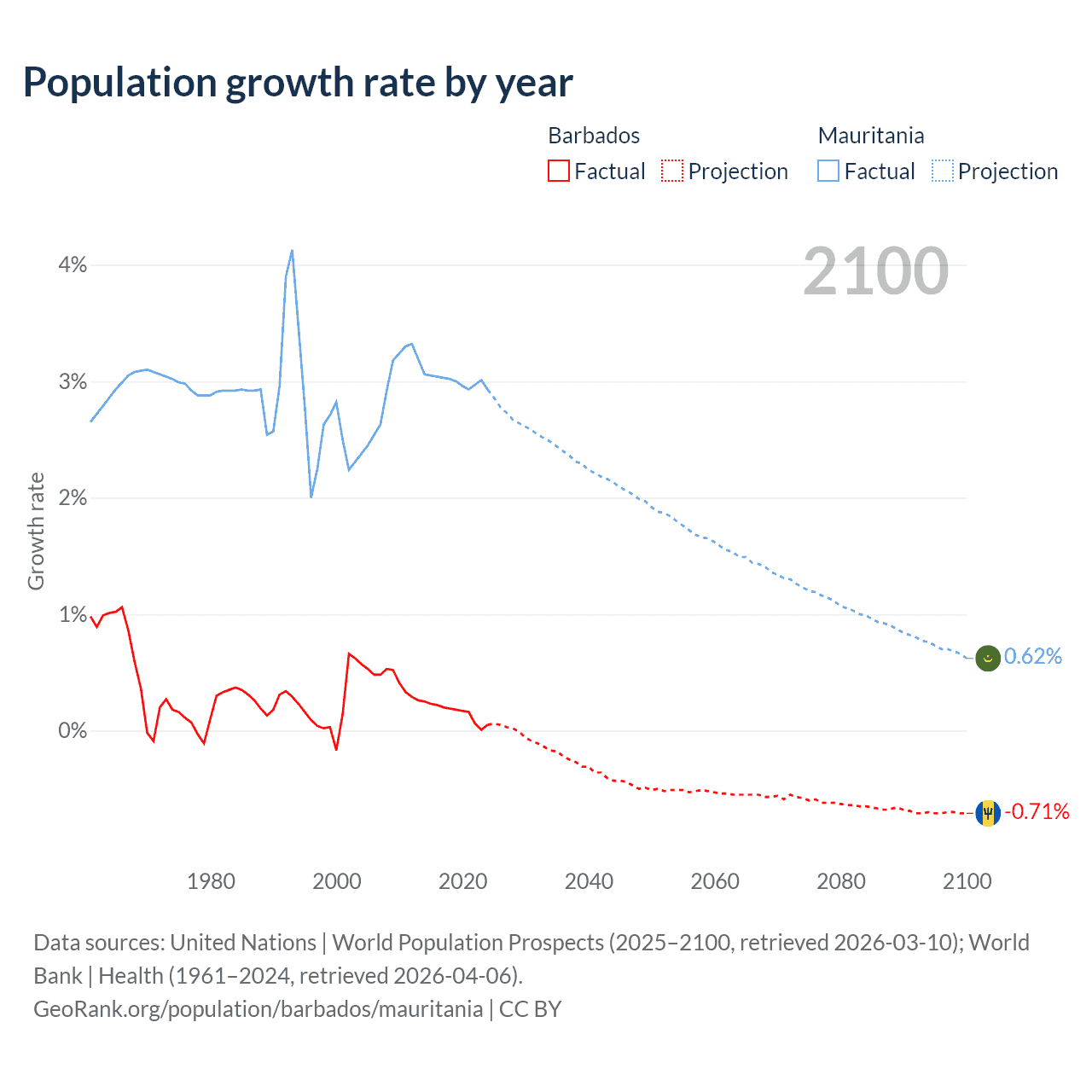 - For the last 10 years, Barbados has had an average growth rate of +0.16% per year vs +3% in Mauritania.