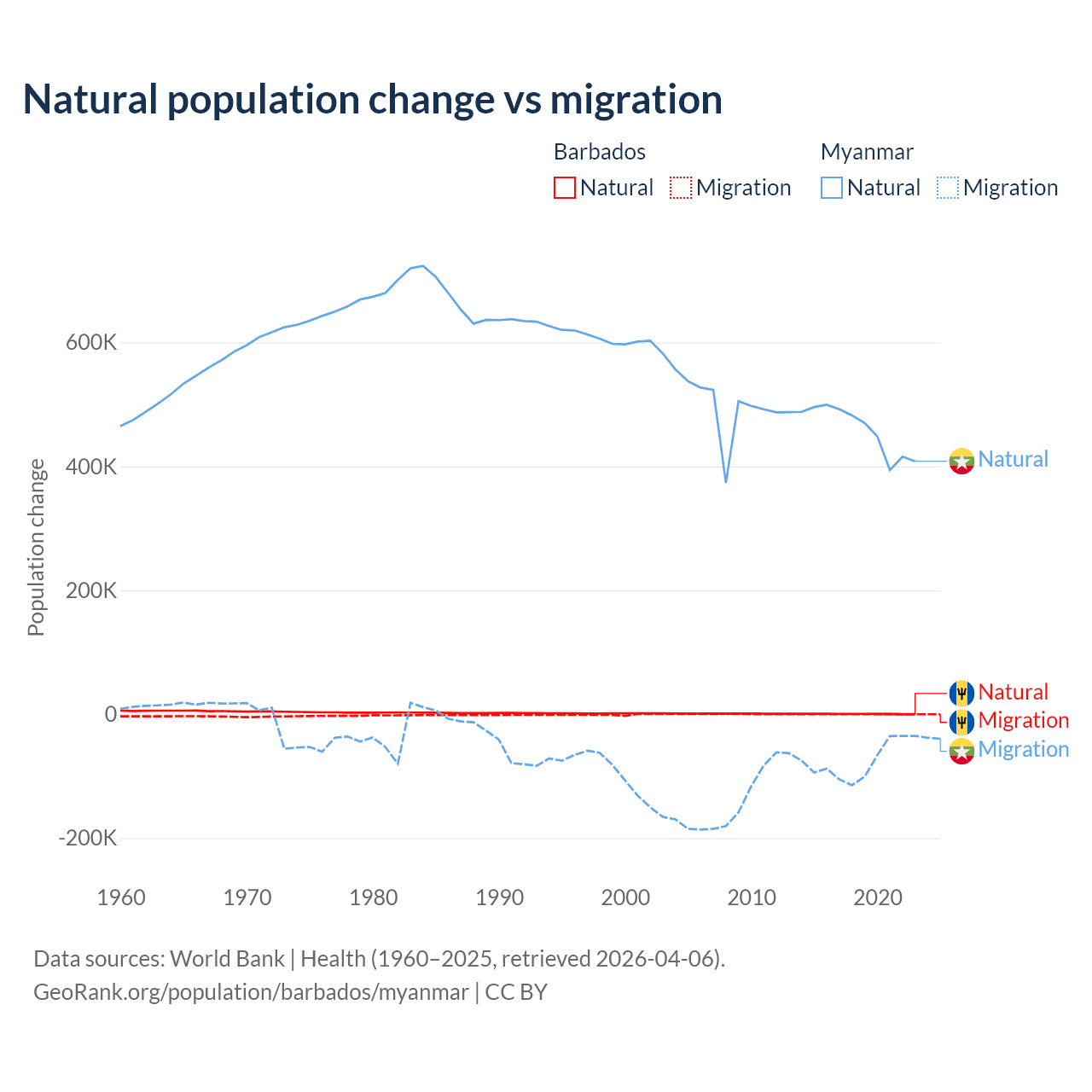 Over the last 10 years, 89.5% of the population change in Barbados is from natural causes (a gain of 4,936 people) and 10.5% is from migration (a loss of 578 people). In Myanmar 86% is from natural causes (a gain of 4,594,615 people) and 14% is from migration (a loss of 749,272 people).