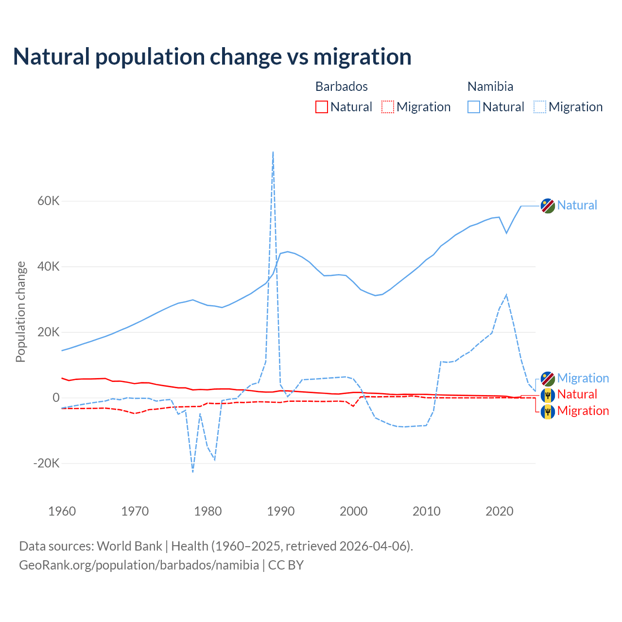 Over the last 10 years, 89.5% of the population change in Barbados is from natural causes (a gain of 4,936 people) and 10.5% is from migration (a loss of 578 people). In Namibia 74.3% is from natural causes (a gain of 532,532 people) and 25.7% is from migration (a gain of 183,837 people).